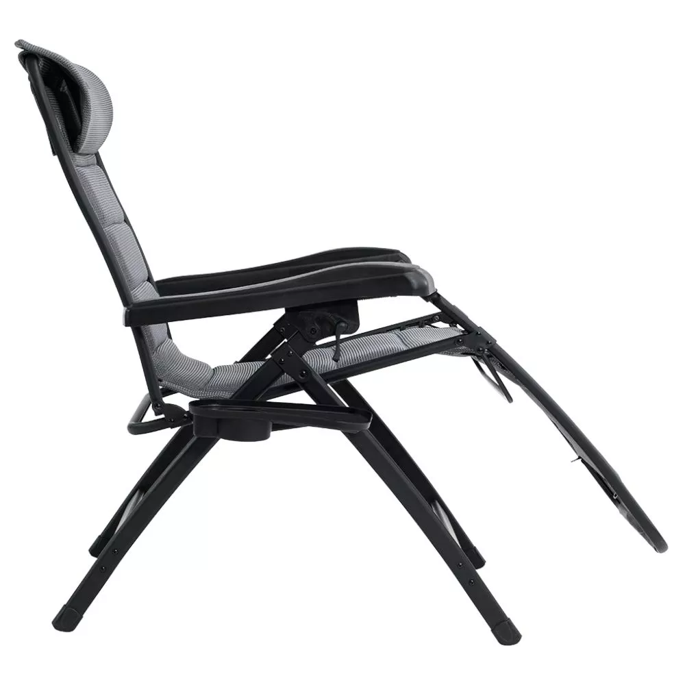 Der Relaxstuhl Outwell Acadia mit einer Belastbarkeit von bis zu 150 kg besitzt eine schnell trocknende Polsterung sowie ein Textiline-Netzmaterial in einem ansprechenden Grauton. Unter dem Bezug ist der Campingstuhl mit einem wasserabweisenden Material versehen, damit sich die Schaumstoffpolster nicht mit Wasser vollsaugen können. Das ist besonders praktisch, wenn der Stuhl einmal im Regen vergessen werden sollte. Zudem lässt sich die Kopfstütze für einen ergonomischen Sitzkomfort einstellen und abnehmen.