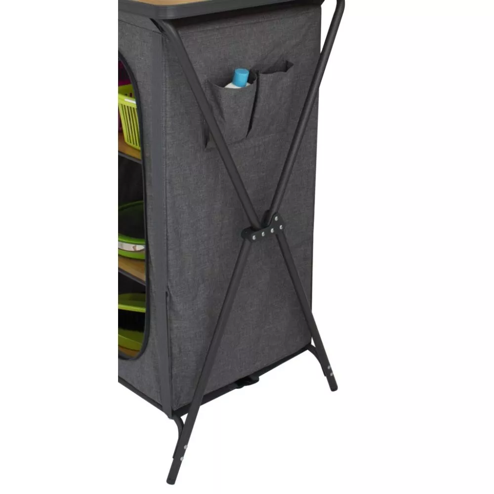 Viel Stauraum bietet der kompakte Campingschrank Eurotrail Nova Lucera mit einer Ablage- und Arbeitsfläche und drei Einlegeböden aus MDF-Bambus. Das leichte und stabile Aluminiumgestell ist schnell aufgebaut. Mit Fenstern, Reissverschlussabdeckung, seitlichen Organizertaschen und verstellbaren Beinen punktet der Camping-Schrank Nova Lucero von Eurotrail mit einer praktischen Ausstattung für die ideale Aufbewahrung auf Reisen – ob Küchenutensilien oder Kleidung.