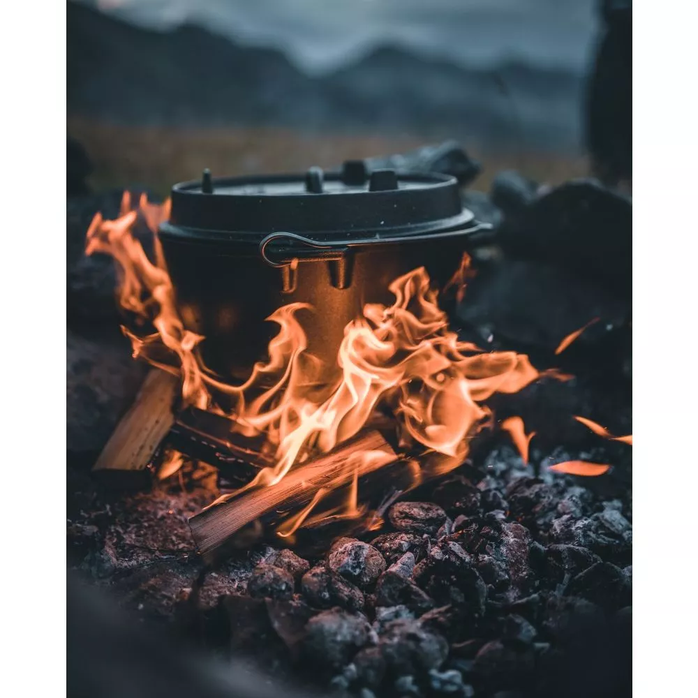 Dutch Oven, Gusseisen – massiv und hochwertig, Deckel auch als Pfanne verwendbar, Töpfe lassen sich übereinander stapeln, Thermometerdurchführung, Henkel mit Kerbe für sicheres Aufhängen über der Feuerschale.