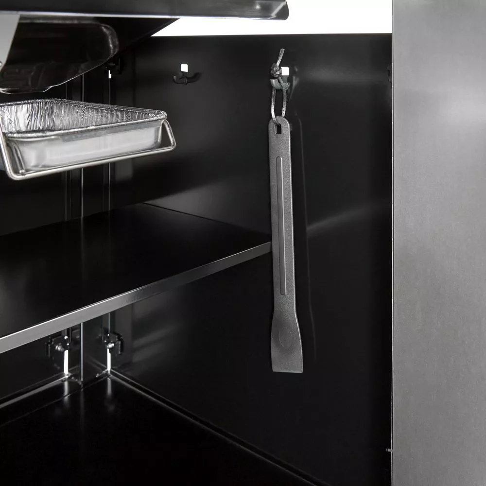 Mit dem stabilen Unterschrank hast du viel Stauraum, um zusätzliche Grillutensilien verstauen zu können. So hast du beim Grillen immer alles griffbereit. Praktische Seitentische, der rechte Seitentisch ist abklappbar, sorgen für mehr Arbeitsfläche, egal ob du Teller, Gewürze oder dein Grillgut darauf abstellen möchtest. Mit vier integrierten Besteckhaken an den Seitentischen kannst du Grillbesteck, Grillbürste oder andere Grillutensilien in greifbarer Nähe aufhängen.