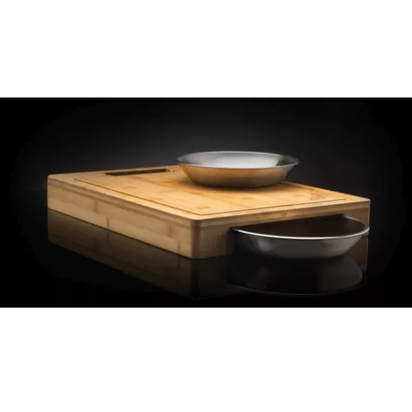 Das Hochwertiges Bambus-Schneidebrett von Napoleon mit 2 Edelstahlschalen zum Auffangen von Fleischsäften und geschnittenem Gemüse.