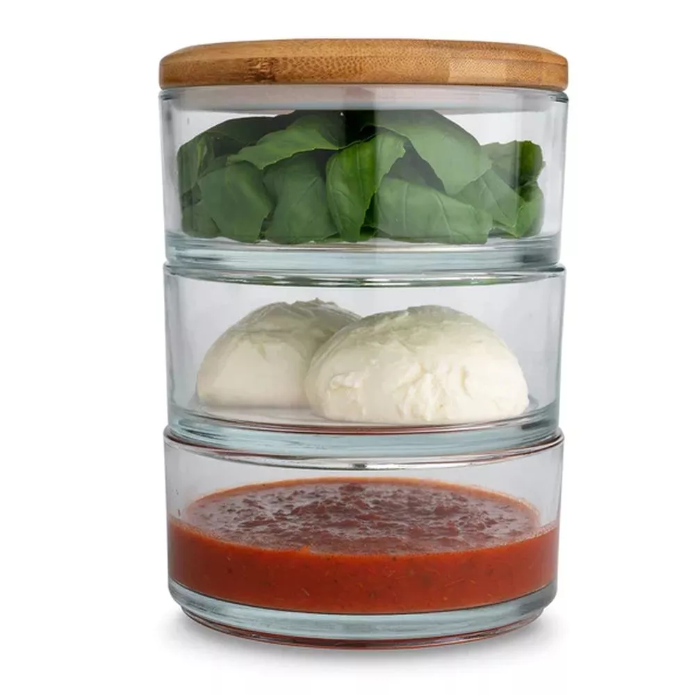 - bestehend aus drei Glasschalen mit Bambusdeckel