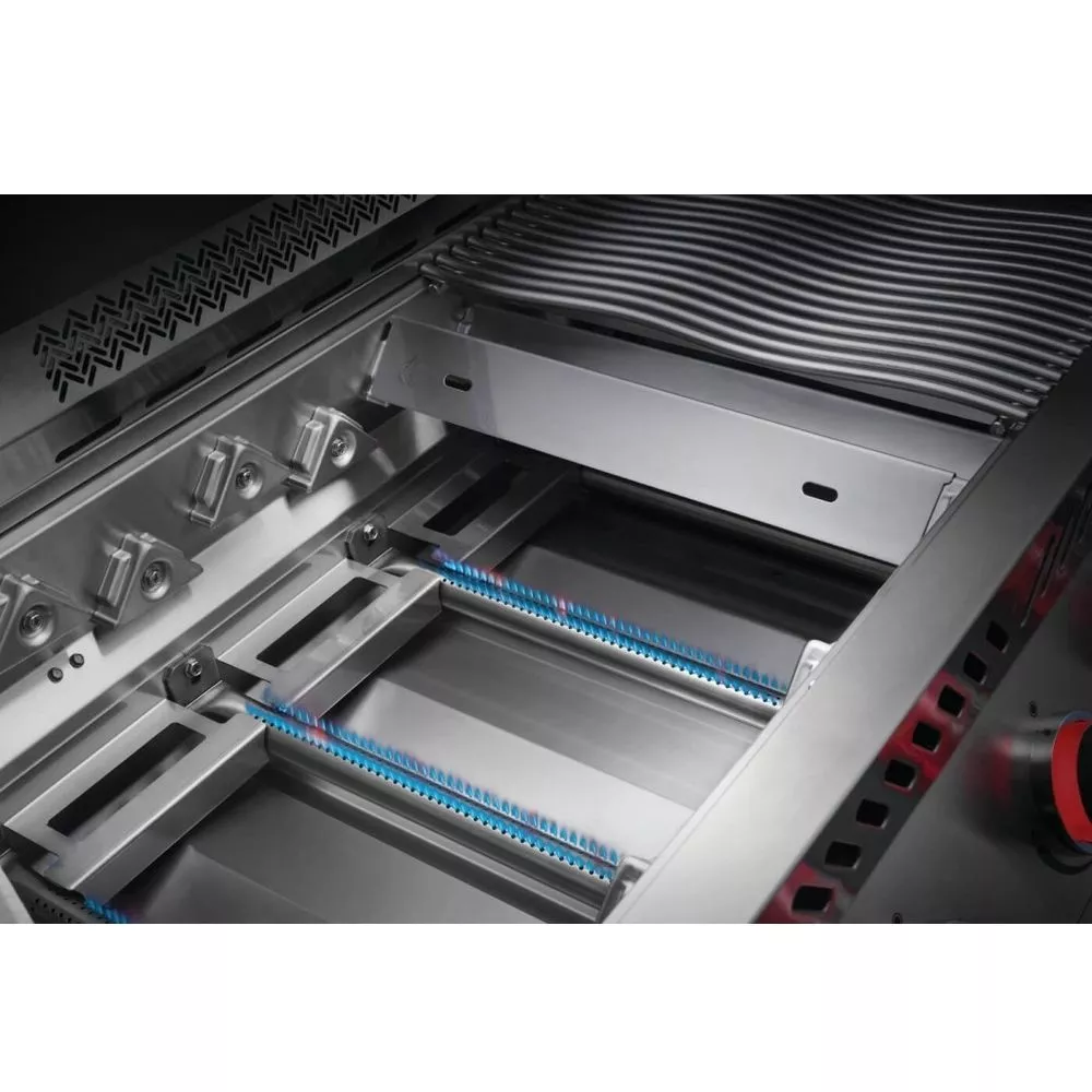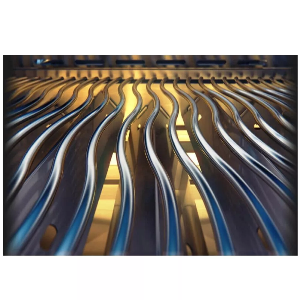 Die Infrarotwärme des Drehspiess-Brenners ist bestens für das Garen bei hoher Hitze und lansames Braten mit dem Drehspiess - WAVE-Stabgrillroste aus Edelstahl (7,0 mm)