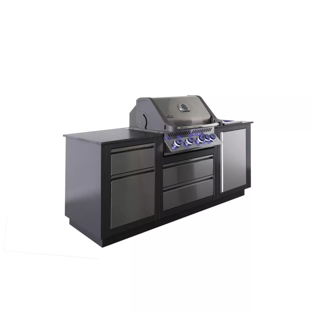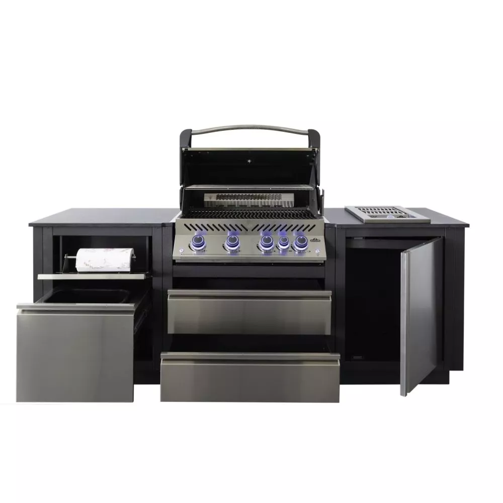 Napoleons kompakte Outdoor-Küche OASIS 105 eignet sich perfekt für jeden Aussenbereich. Sie bietet die optimale Grösse an Stauraum und Arbeitsfläche zusammen mit dem grossen Napoleon Prestige 500-Einbau-Gasgrillaufsatz. Jeder Schrank ist auf Langlebigkeit ausgelegt und besteht aus kohlefarbenem, pulverbeschichtetem, verzinktem Edelstahl. Auch die hochwertige 20-mm-starke Arbeitsplatte aus Steinfeinzeug der bekannten italienischen Marke ‚Marazzi‘ ist äusserst beständig und robust. Die OASIS Outdoor-Küche lässt sich leicht installieren und enthält alle notwendigen Details. Für die Strom- und Gasleistungen sind Aussparungen vorhanden und die Füsse sind höhenverstellbar.
