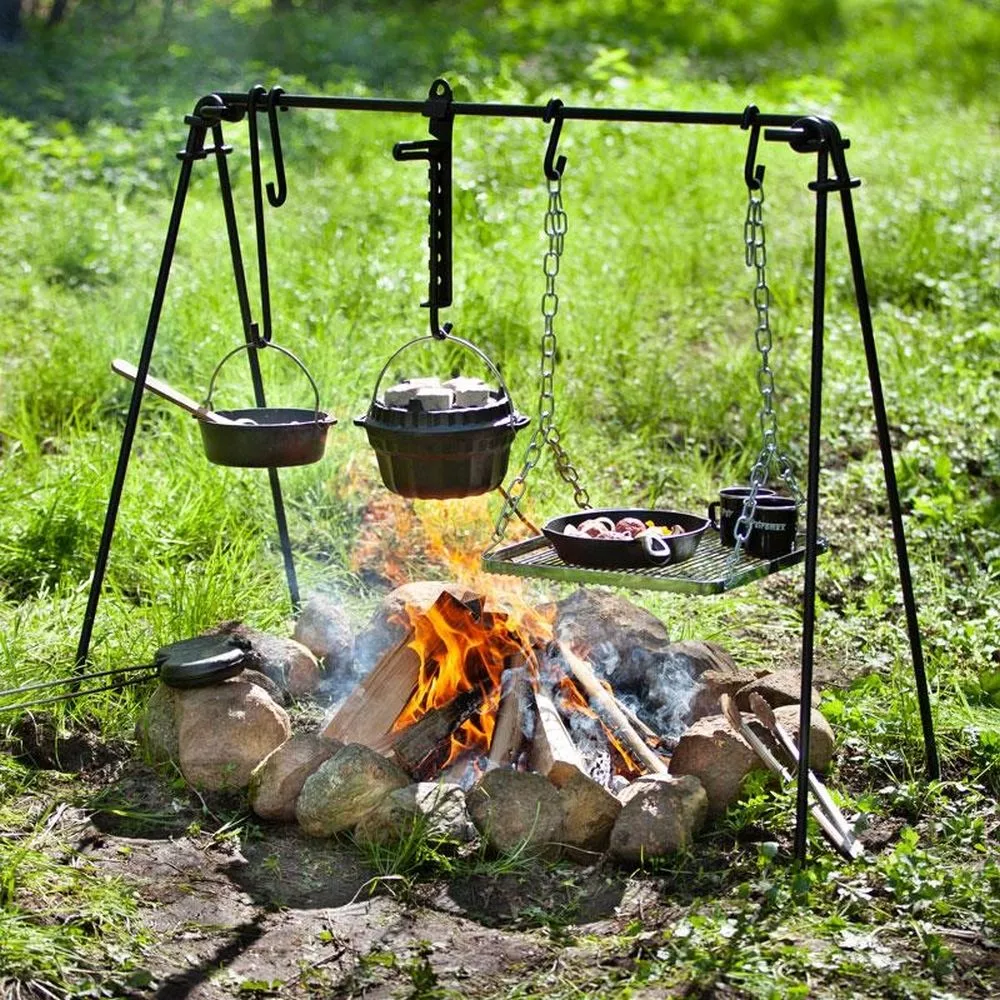 Die Feuerbrücke steht dank der Ösen-Konstruktion sicher auf vier Beinen und ist in Kürze einsatzbereit. Dank der 115 cm langen Querstange kannst du deine Camping-Küche über einer oder mehreren Feuerstellen aufbauen. An den drei Haken unterschiedlicher Länge hängst du dein Kochgeschirr in variabler Höhe über dem Feuer ein. Auf diese Weise regulierst du die Gartemperatur deiner Speisen und Getränke auf Wunsch in drei Stufen. Der Grillrost verfügt über eine in der Länge flexibel einstellbare Kettenaufhängung. Die umlaufende Umrandung hält dein Grillgut sowie Pfannen und Co. sicher an ihrem Platz. Mit dieser Profi-Draussen-Küche sind auch mehrgängige Lagerfeuer-Menüs für all deine Camping-Freunde keine Herausforderung mehr.