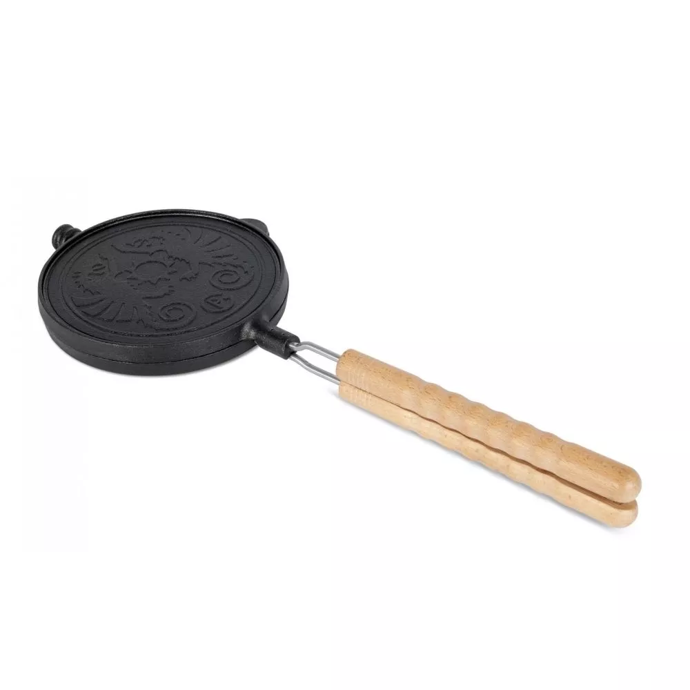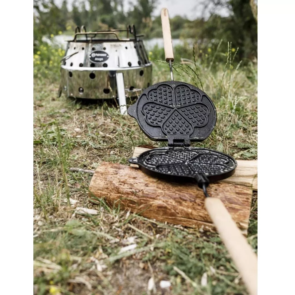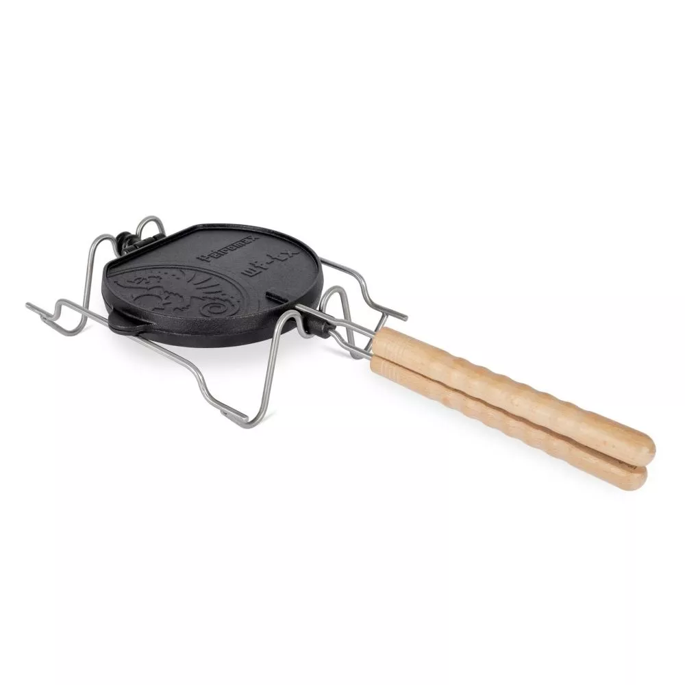- massives Wende-Waffeleisen zur Zubereitung von leckeren Waffeln direkt im Feuer oder in heisser Glut – mit Halterung